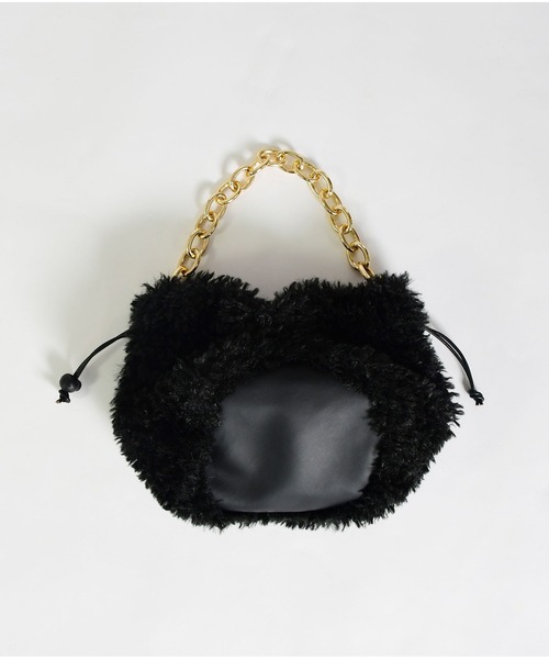 持ち手のゴールドのチェーン、底のフェイクレザーが大人っぽく、品よくきまるアイテムです。