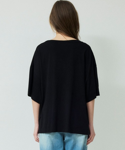 ドロップショルダーで肘が隠れるラフなサイズで、生地のドレープ感が女性らしい一枚。