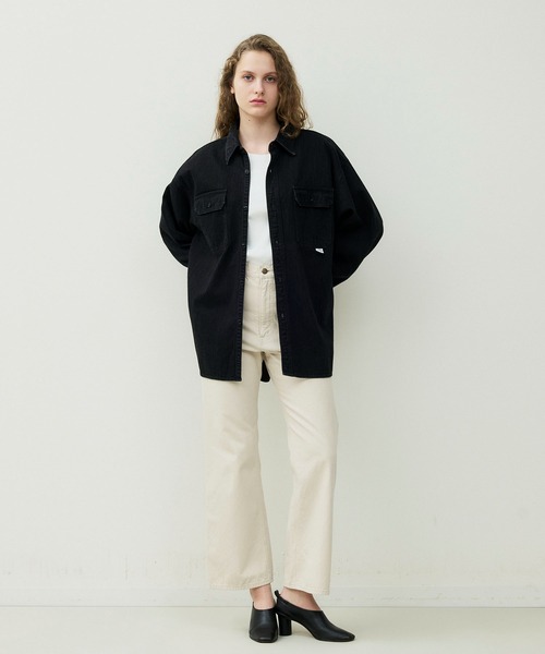 フラップ付きのダブルポケットや、裾のカーブなどワークシャツならではのディティールを活かしたデザインで、女性が着た時に華奢に見えるよう肩の位置やポケットの位置を調整しています。