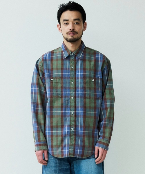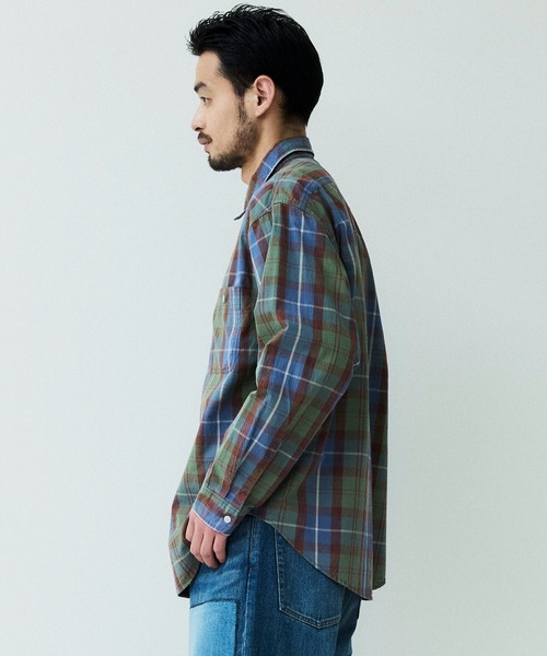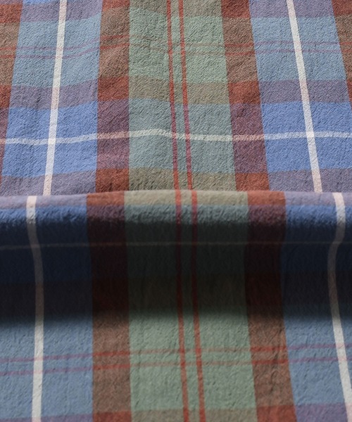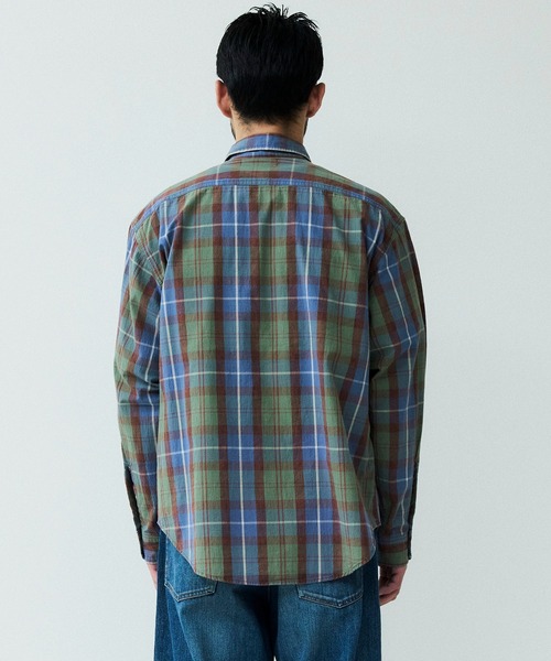 通常、チェック柄に織り上げた生地にブリーチ加工をすると赤く変色してしまうのですが、特殊な加工を施す事で長く着込んだような退色感が生まれ、ヴィンテージシャツのような風合いを再現しています。
