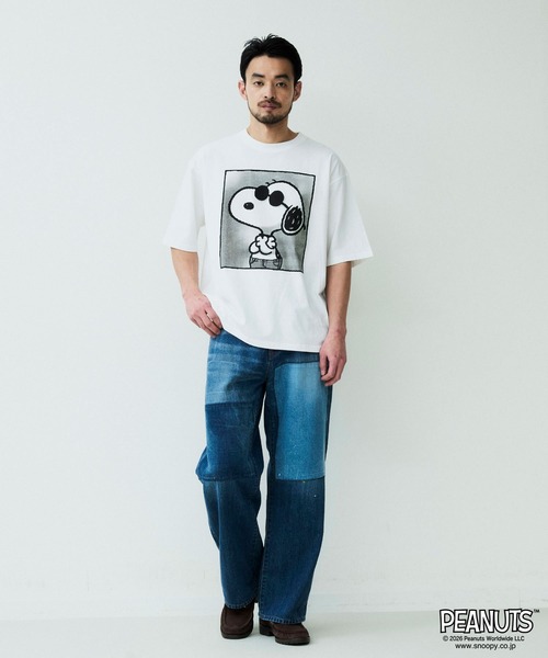 トレードマークの丸いサングラスをかけたスヌーピーがプリントされた、シンプルな中にもアクセントのあるデザインで、デニムアイテムにも好相性のアイテムです。