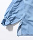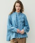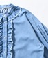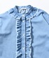 肌に馴染む柔らかいライトデニムを使用し、衿ぐりと前立てにふんだんにあしらったフリルデザイン。
