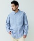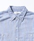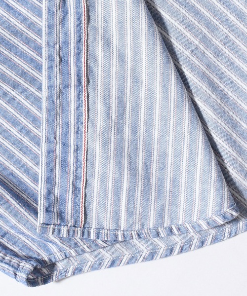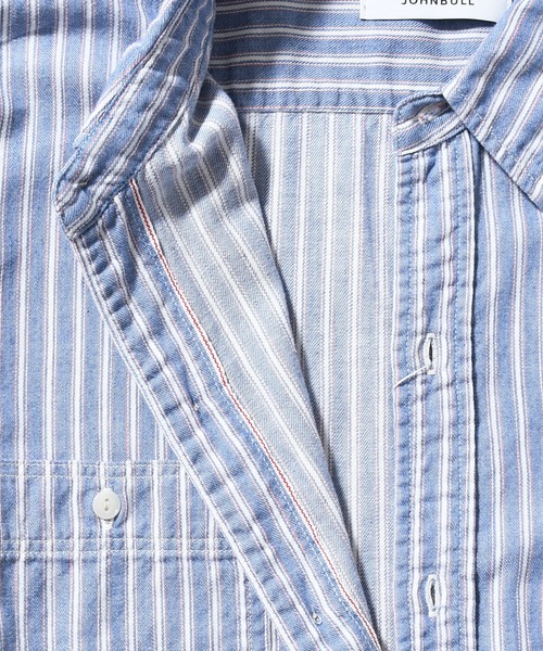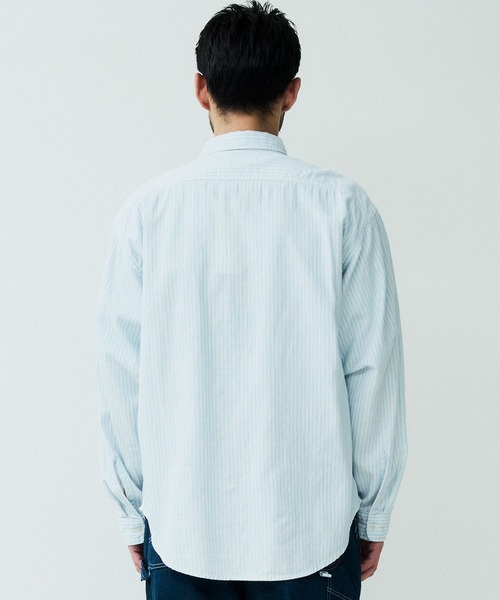 ストライプ柄のセルヴィッチ生地を使用したロングスリーブワークシャツ。