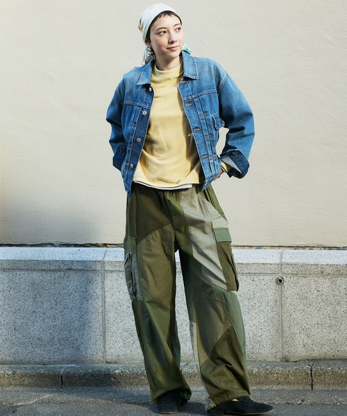 製品や古着、未使用の生地などデニムを使用した6ポケットのカーゴパンツ。