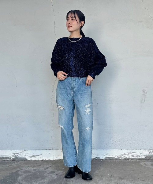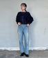 "ハードなダメージ加工と爽やかなブルーの色合いがお気に入りです。シルエットはワイドストレートで脚長効果もあり、ヒップや腿周りのラインもカバーしてくれます。ダメージ加工ですが、大人な女性にも穿きやすいダメージなので、年齢問わずかっこよく穿いていただけるジーンズです。トップスは明るいカラーや女性らしいトップスで、メリハリのあるスタイリングに仕上がります。"