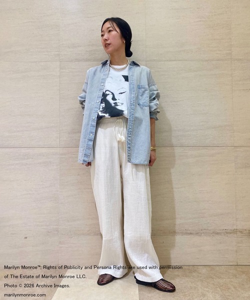同じ素材を使用した、Indiaダブルクレープペプラムシャツ(JL261S09)とのセットアップがおススメで、暑い季節を爽やかにしてくれる一枚です。