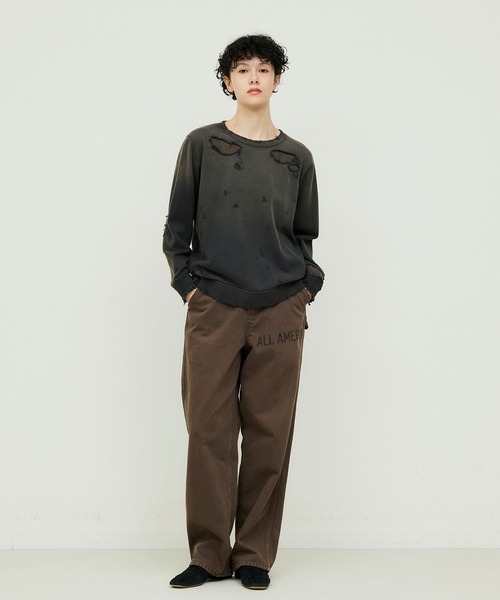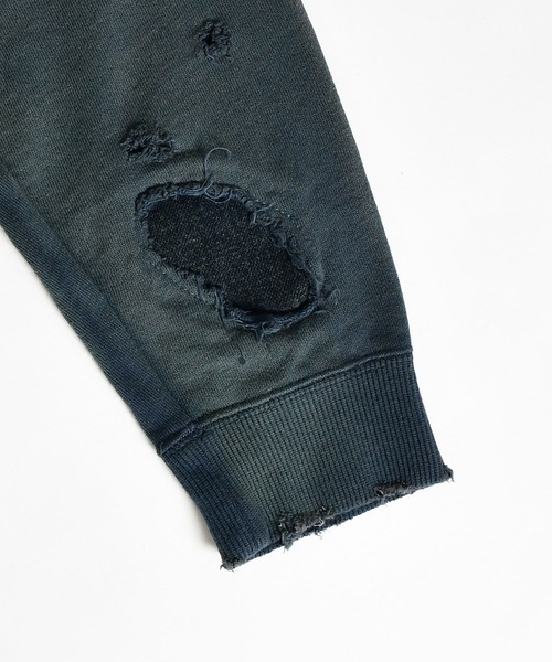 やや薄手の7.4オンスの裏毛を使用しており、ダメージ加工、さらに随所にリメイク加工を施しヴィンテージライクな雰囲気をプラス。