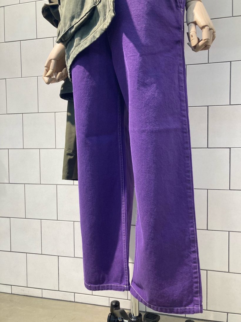 パープルが目を引くオーバーダイシリーズのオーバーオールにブルーのネルシャツパッチワークを合わせました。ネルシャツを羽織ではなく、インナー使いにしているのがポイント。パープルとブルーの配色が鮮やかでどこか大人なオーバーオールコーデ。
