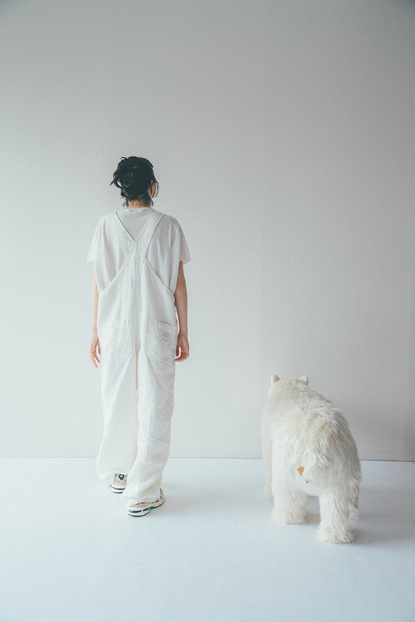オーバーオールのデザインベースはフランスのワークウェアで、最低限の機能を持たせたシンプルなデザインです。そんなシンプルなワークウェアをkanocoさんはオーバーサイズでの着こなしを提案してくれました。オーバーサイズオーバーオールは腰回りがゆったりとし過ぎていて、女性が着用するには腰回りの緩さが不安に感じることが多くあります。そこで今回のオーバーオールは少し股上を深くしウエストの穿き位置を上げることで腰回りの不安定さを解消させ、安心して着用できる緩さをデザインしました。SとMでウエストに10㎝のサイズ差を付けていて、kanocoさんのようにオーバーサイズで着たい方はMサイズ、程よくオーバーサイズを楽しみたい方はSサイズがおすすめです。