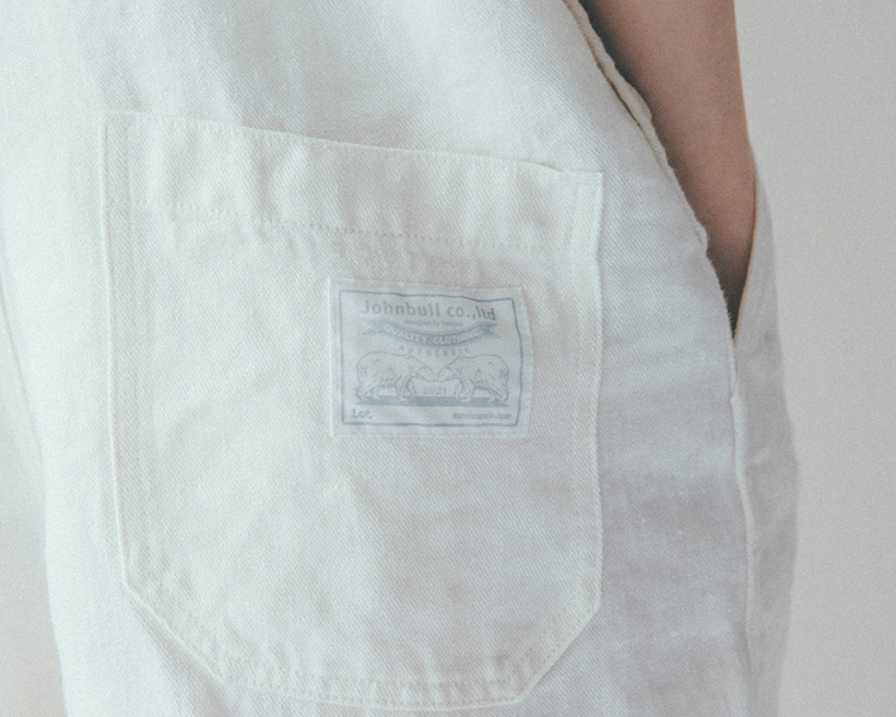 デニムのオーバーオールは80~90年代のデニムをイメージして作られた生地を使用。縦糸横糸ともにムラの無いストレート糸を使用しており、加工を施した際もタテ落ちではなく少しシボが出たような独特な表情の色落ちが特徴です。加工は古着っぽさが出すぎないようにももやお尻のアタリは出さずに適度な色落ちになるようにこだわることで、大人で上品な加工感に仕上がりました。