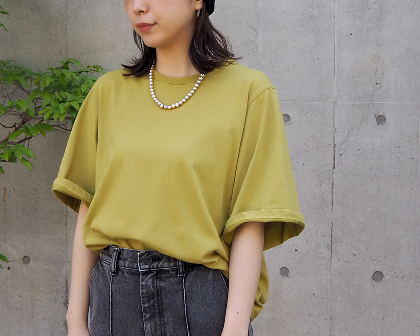 着用レビュー:ゆるっと大きめなTシャツですが肩線が落ちていないのでメンズ過ぎないシルエットがポイントで形をきれいに見せてくれます。体のラインも拾わず、裾をアウトで着た時にも合わせやすいすっきりとした丈感が嬉しいですね。