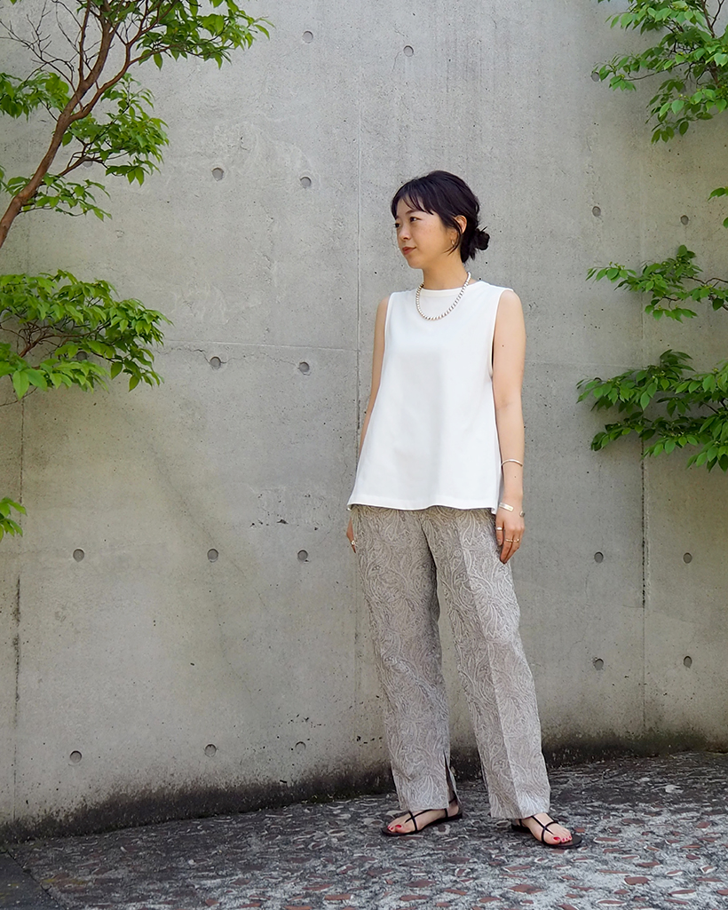 着用レビュー:甘すぎないAラインのシルエットがポイントで、パンツだけでなくスカートとも合わせられそうな万能さを感じます。私はジャガードのパンツと上品に合わせましたが、夏にサロペットやオーバーオールのインナーとしても活躍しそうです。