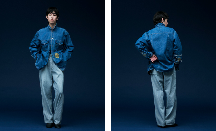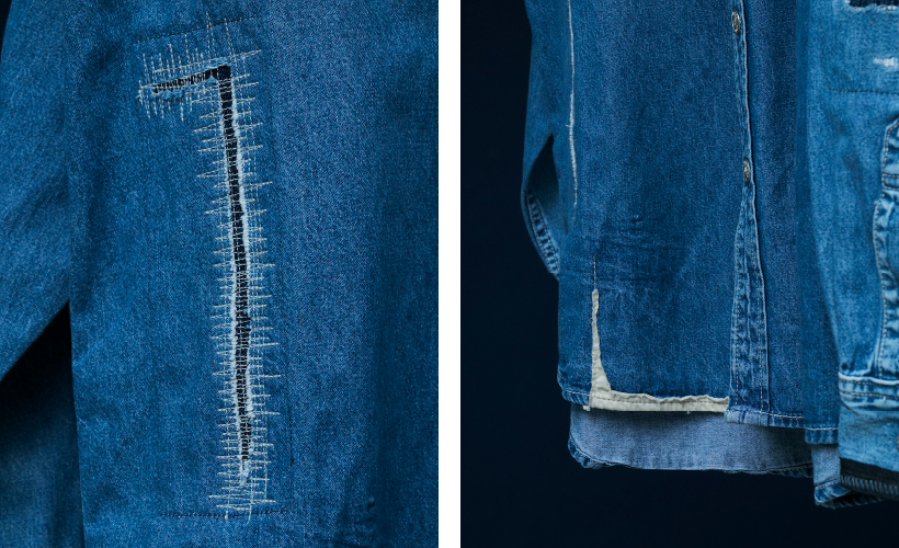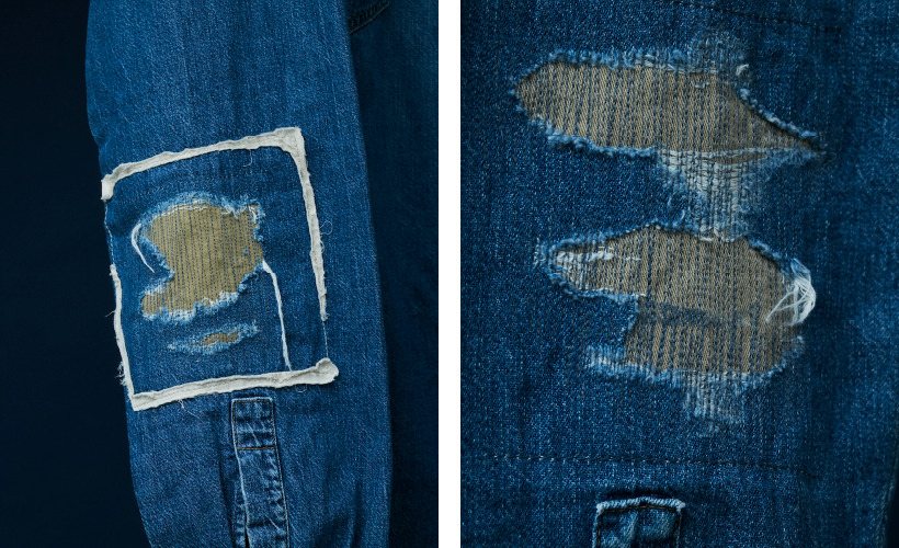 今回のリメイクはオイル染みや汚し、ペイントなどは施さず、一つ一つピックアップされたデニムシャツの状態を活かしながら、ポイントになるリペア加工を施しました。こちらのリメイクデニムシャツは、縦に裂けてしまった部分のリペアや、表に付いていた当て布が一部だけ残った雰囲気、袖口の生地と異なる色のステッチがポイントになったり、派手すぎないけどリメイクの佇まいがちゃんと感じられる雰囲気に仕上げています。