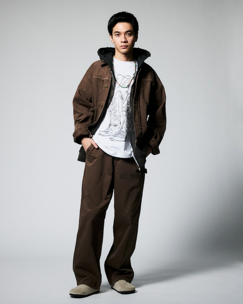 そして、今回のプリントはジャケットからパンツに渡って施されており、セットアップで着た時に一つの柄として完成するプリントギミックが隠されています。