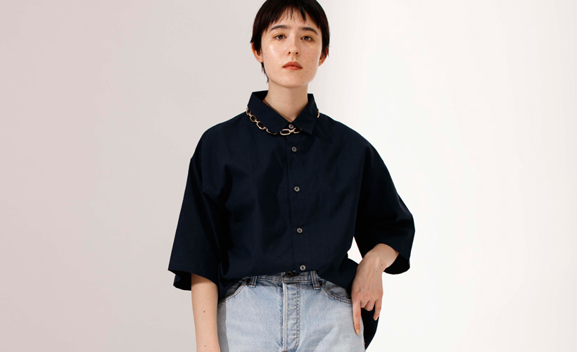 ネイビーカラーのオーバーシャツとデニムパンツは引き算を意識したミニマルスタイル。オーバーシャツはソフトタッチでハリ感が抑えられたオックスフォード生地を使用しており、程よい落ち感が心地いい。シャツとデニムだけではバランスが悪いので、首元にはシンプルなゴールドアクセを。シューズとバッグは散らかさずに同系色のブラックをチョイスすれば、カジュアルながら上品さのあるスタイルが完成。