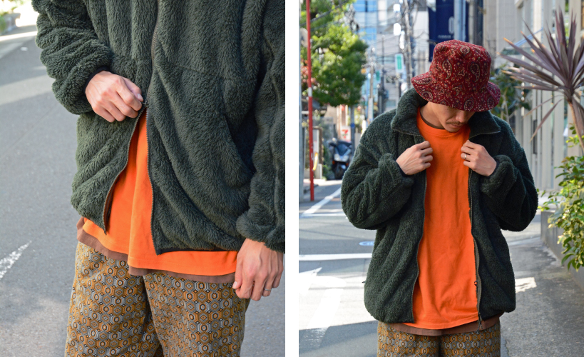 フリースの定番の形でもあるジップジャケット。首元まで高さがあるのでしっかりと風を防いでくれます。これからの時期にはアウターとして、真冬にはアウターの中に着るインナーとしても活躍できる万能なアイテムです。シンプルなデザインだからこそ柄アイテムと合わせていただきたいです。