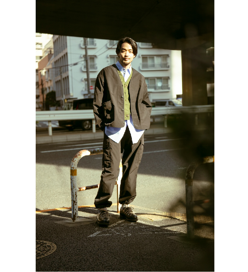 シックな印象のセットアップですが、上下どちらもデザインベースはミリタリーなので普段使いもしやすい。シンプルにシャツだけで合わせてもいいけど、本格的なディティールが魅力の【Sewing Chop O'alls】のベストを差し込みスタイリングのアクセントに。