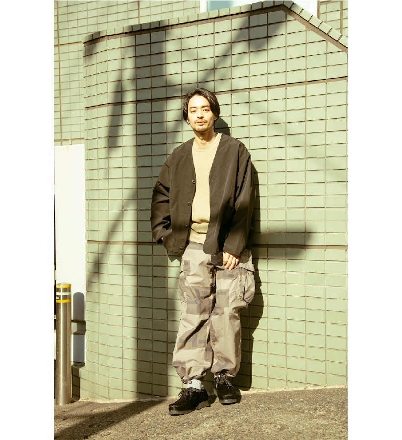 カーディガン感覚で使えるノーカラージャケットはドライタッチのスプリングニットにラフに羽織れば、気負わない大人のイージースタイルに。市街戦での使用を目的とされた幻の都市迷彩"Tパターン"を採用した【Sewing Chop O'alls】コンバットトロピカルトラウザーがアーバンミリタリーに見事にマッチ。