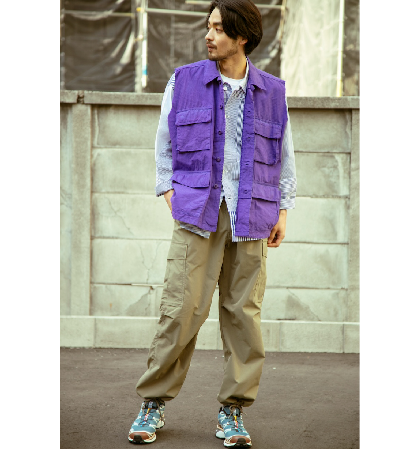 POPなカラーが他にない【TOP KHAKI】のBDUシャツベストはミリタリーの要素がありながら一気に春の装いに。ミリタリーというキーワードが統一されているので、カーゴパンツとも難無く合わせられる。足元のドローコードを絞ればシューズもスタイリングのポイントに。
