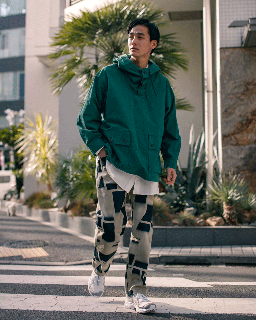 リリースから大好評の【THE KYOTO BASSEN】のボトムスにハイテクスニーカーとアノラックを合わせたMIXスタイル。伝統ある京都友禅の技術でデニムにアプローチしたアイテムを合わせる事で、懐かしくも新しいモダンな印象へ。