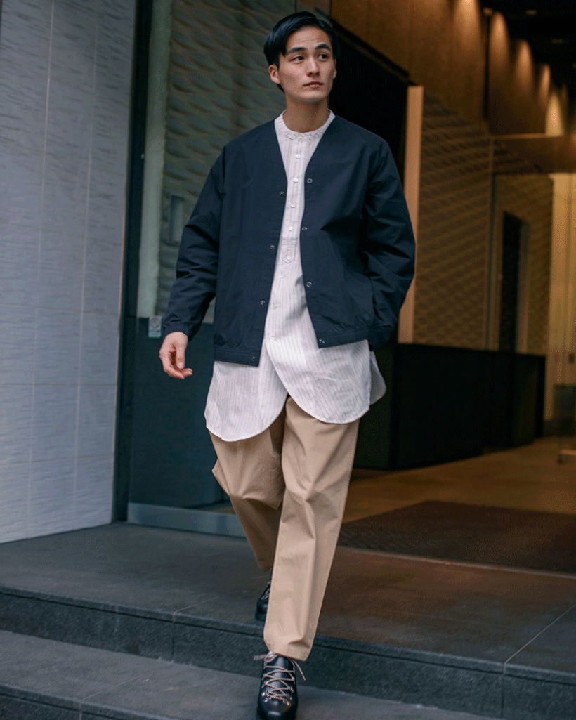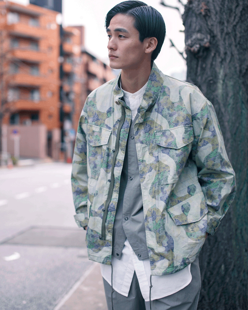 シャツのように軽量なフィールドジャケットはインパクトのある総柄で取り入れつつ、その他のアイテムもオリーブベースで統一させミリタリーライクなスタイルへ。インナーの丈感やスッキリとした首元の合わせなど、重ねるバランスもしっかり意識して。