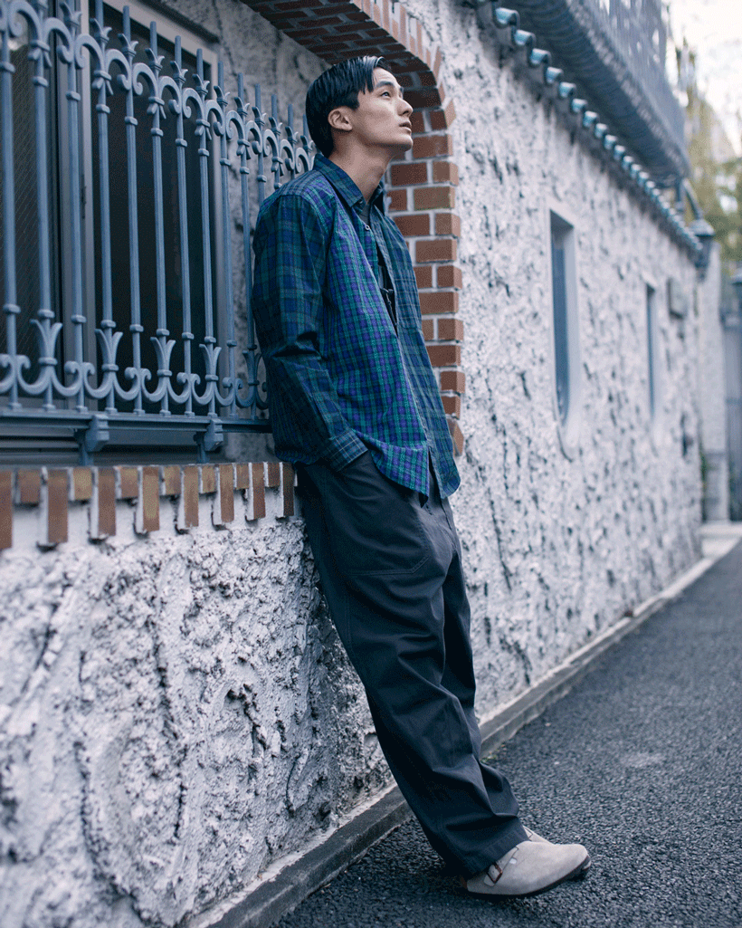 フロントジップがアクセントになる新作オーバーオールをブラックトーンで合わせたスタイリング。カジュアルなチェックシャツをラフに羽織りつつも、全体の色味を統一することで、リラックス感にシックな要素もプラス。