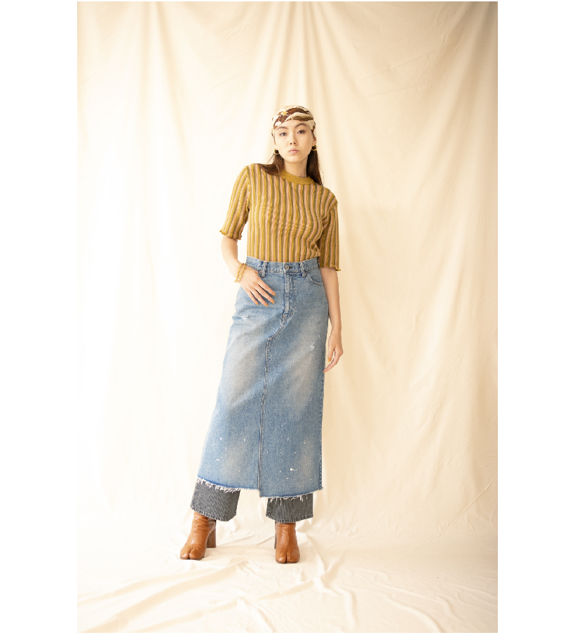 デニムスカートに"DENIM DELIGHT DAYS"オリジナルのピケデニムをちらっとのぞかせた70’sライクなレイヤードスタイル。トップスに合わせたガーターストライプニットのレトロなカラーリングがスタイリングの雰囲気をぐっと高めます。