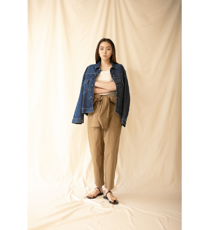 まだまだ暑い日々が続くので、オールインワンはウエストで結んでヘルシーな肌見せスタイルでの着用がグッド。肩からかけた"DENIM DELIGHT DAYS"のGジャンは1950年代に登場したセカンドモデル。90年代のデニムジャケットを彷彿とさせるひげ加工のないフラットな見た目が今の気分にぴったり。