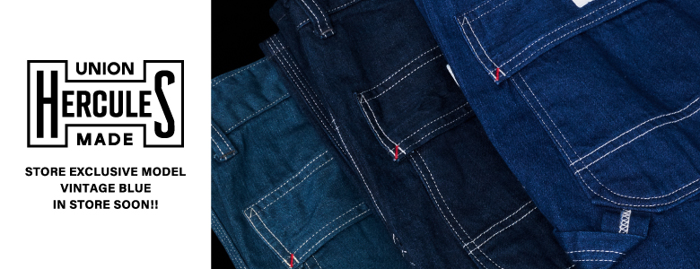 UNION HERCULES MADE (ユニオン ヘラクレス メイド) はジョンブル監修によるヴィンテージワークウェアブランド HERCULES を岡山の高い加工技術と職人の手によるヴィンテージ風ダメージ加工を施しアップデートしたデニムブランドです。