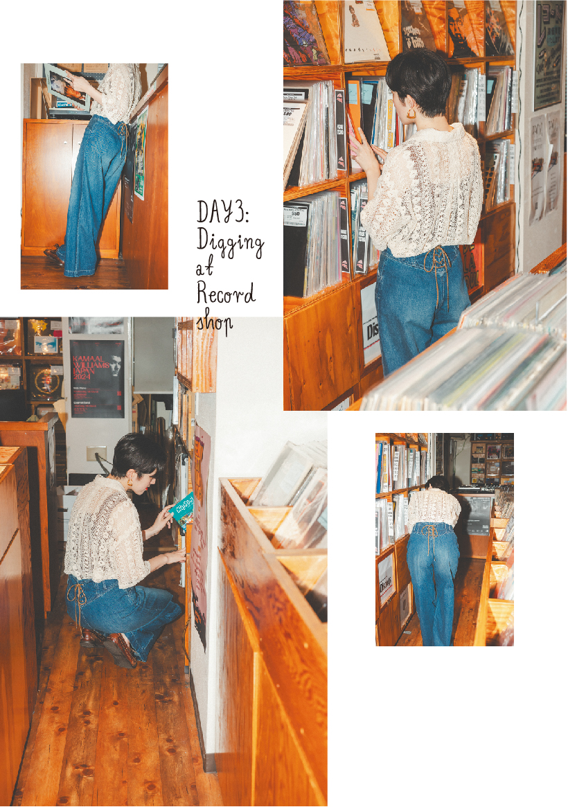 最近、レコードに夢中(気になるアイツがレコード通なのもあるけれど)。渾身の一枚を探し出すのも、盤に針を落とすのも、ワクワクする!今日のお目当てはシティ・ポップのレコード。集中してディグりたいから、レースアップデザインのデニムをはいてきた。自信が持てるキュートな後ろ姿で、不意にアイツに会っても大丈夫。