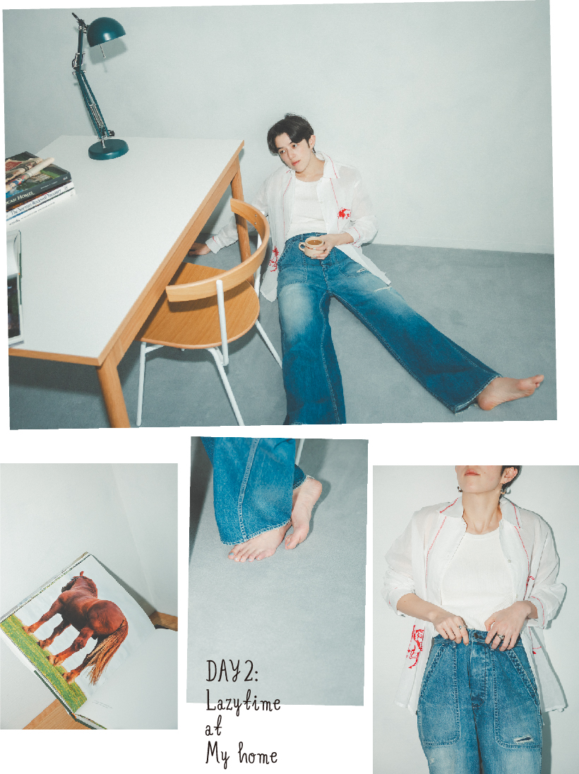 ハードワーク続きだった週のウィークエンドは、おうちでとことんダラダラしよう。部屋の隅に積んだままになっていたアートブックのページでもめくってみようか。インスピレーションを刺激するこんな日のおともには、加工の具合が絶妙なデニムを。本格的な風合いながら生地はソフトで動きやすいのもうれしい。部屋でひとり、こどもみたいに逆立ちなんてしてみちゃったり。