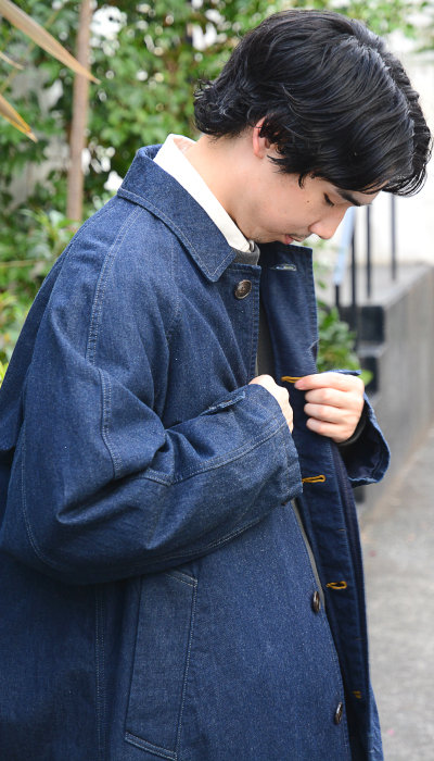 フォーマルなスタイルがお好きな方はバルマカーンコートがおすすめ。形はフォーマルなコートですが、デニム素材なのでスウェット等のカジュアルなアイテムとも相性抜群です。中に着こんでいただければ冬にも着ていただける一着です。