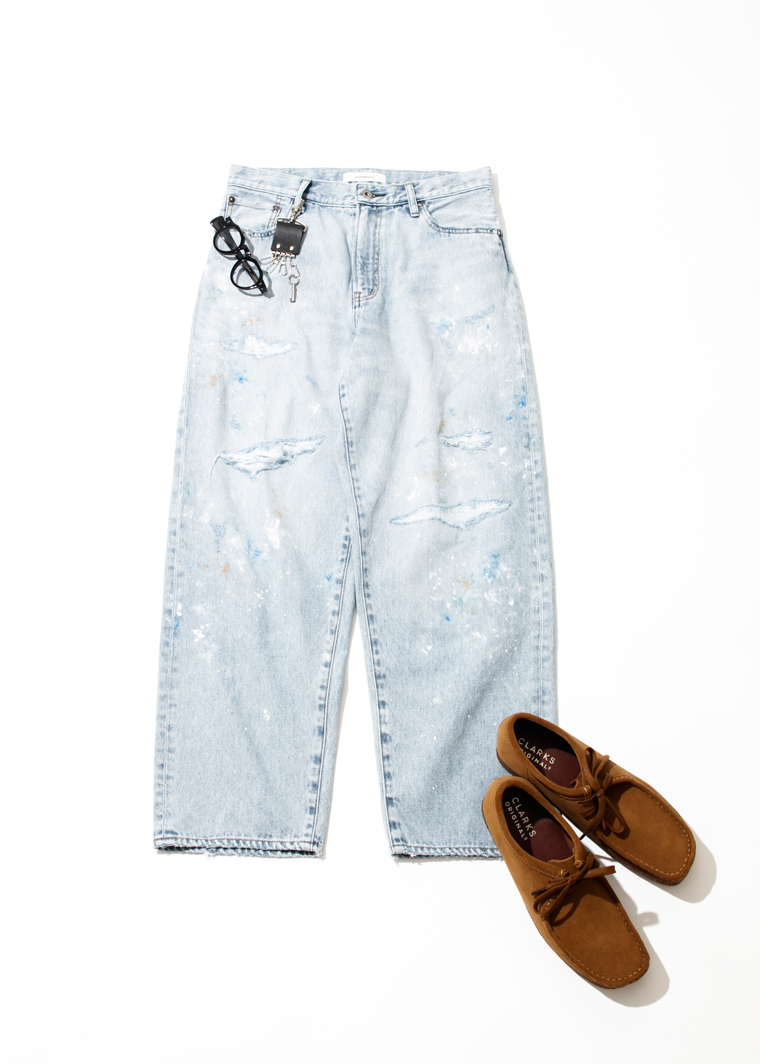 JOHNBULLの加工職人が1本ずつ丁寧にダメージ加工とペイント加工を施したこだわりのダメージジーンズ。ヴィンテージらしい本格仕様な表情ですが、春夏らしいライトで爽やかなカラーリングがクリーンなスタイルにもマッチする。