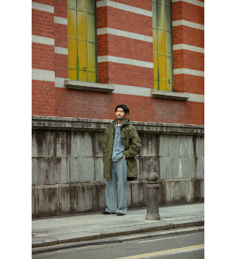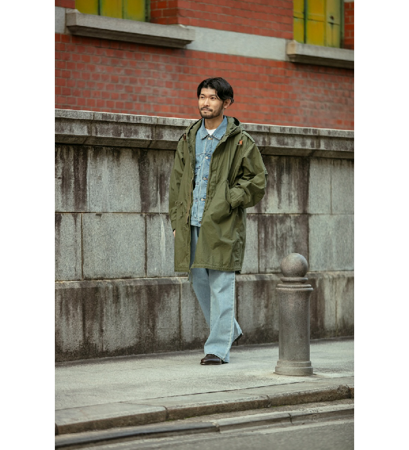 全体的にフェードさせたインディゴカラーが今っぽくてお気に入りの【DENIM DELIGHT DAYS】のセットアップです。セットアップだけだとカジュアル過ぎて落ち着かないので、羽織りはミリタリー、足元は革靴で王道のデニム×ミリタリースタイルがオススメ。