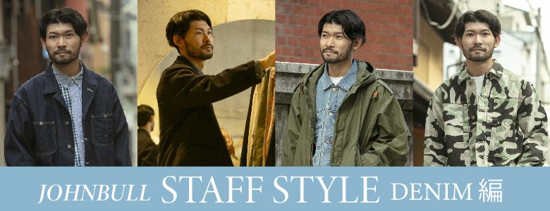 2024年のスタートと同じく店頭に並んだ【DENIM DELIGHT DAYS Vol.6】を始め、多くのデニムアイテムが続々とデリバリーされています。今回はJOHNBULL京都店のショップスタッフに、デニムにフォーカスしたスタイルを4スタイル着こなしてもらいました。