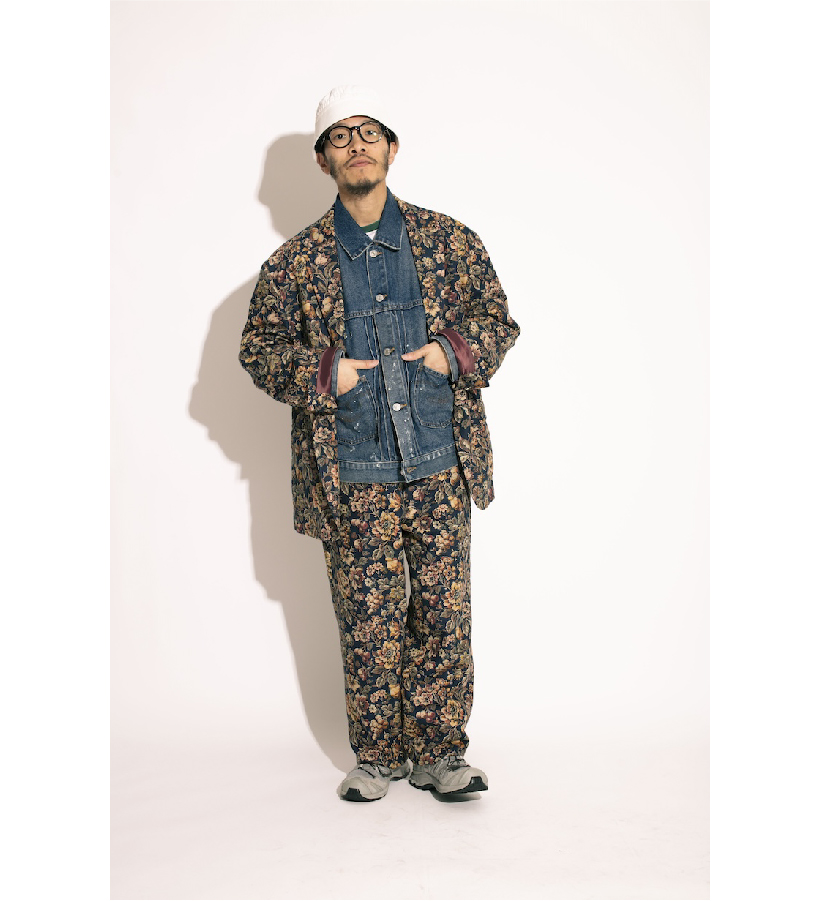 花柄ジャガードセットアップにデニムジャケット。ジャケットは羽織のイメージでサイズアップして着用しています。