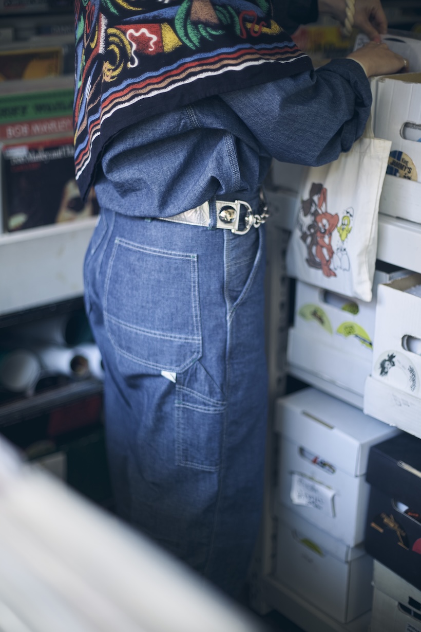 デニムは好きなのですが、古着が多め。きれいめなインディゴブルーがとても新鮮でした。ここ数年はセットアップも好きなので、上下セットにしてツナギみたいに着てみたら今の気分にぴったり。トップスはハーフジップなので色々な着こなしが楽しめそうだと思いました。前に何かの占いで牡牛座はデコルテを出した方がいいと書いてあったので、それで何となくそういうアイテムを選びがちだったりします(笑) デニムセットなので、シルバーの個性があるベルトをアクセントに。とあるジャマイカ盤レコードのジャケット柄ライクなスカーフはコントラストが強めではありますが、デニムセットに合わせるといいバランスで馴染みますし、好きな柄が映えていて嬉しい。