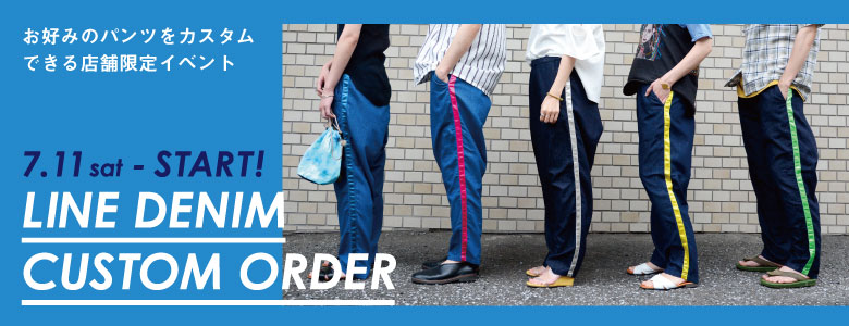 この春夏大人気のラインデニムイージーパンツのカスタムオーダーイベントがJohnbull Private labo各店で7/11(土)からスタートします!お客様のお好みに合わせて、パンツのデニム生地を3種類の中から、サイドのラインテープを12色の中からカスタムオーダーできる直営店限定イベントです。サイズはS,M,Lからお選びいただけます。お好みの1本を探しに、ぜひお近くのJohnbull Private labo各店にお立ち寄りくださいませ。