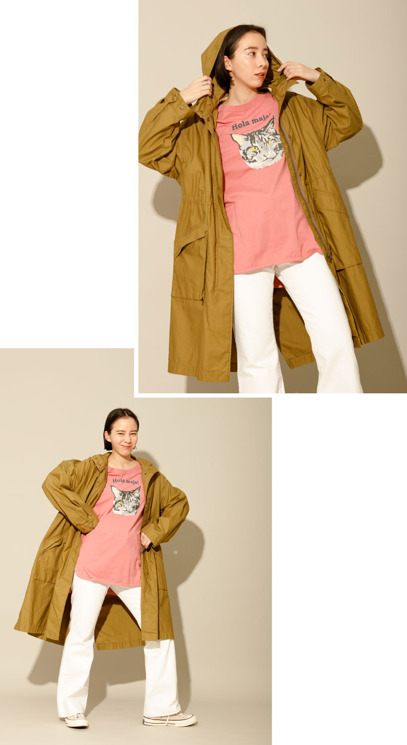 猫好きにはたまらない、猫のフェイスプリントがかわいらしいファニーなプリントTシャツ。カジュアルな印象ですが柔らかく落ち感のある素材がどこか上品で女性らしいシルエットです。少しメンズライクなモッズコートなどとも相性が抜群。