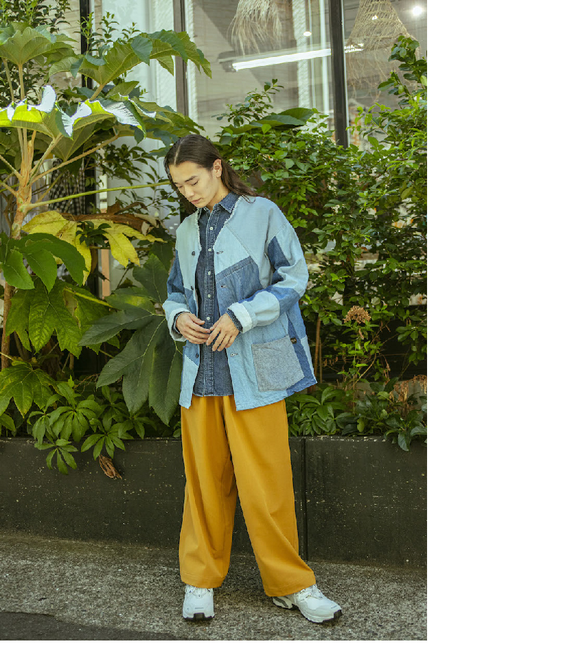 一枚で主役になるパッチワークジャケットは、秋らしいマスタードカラーと合わせて。