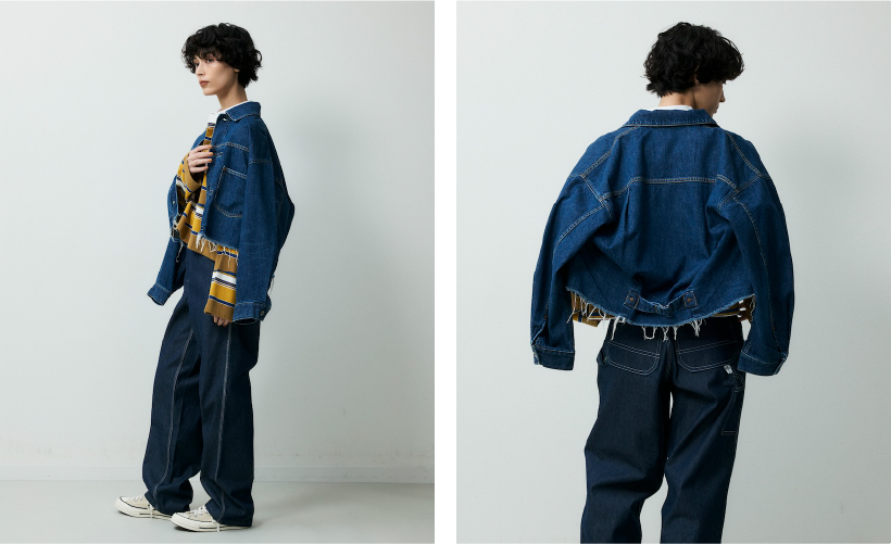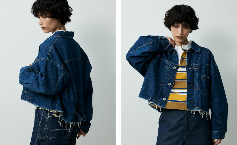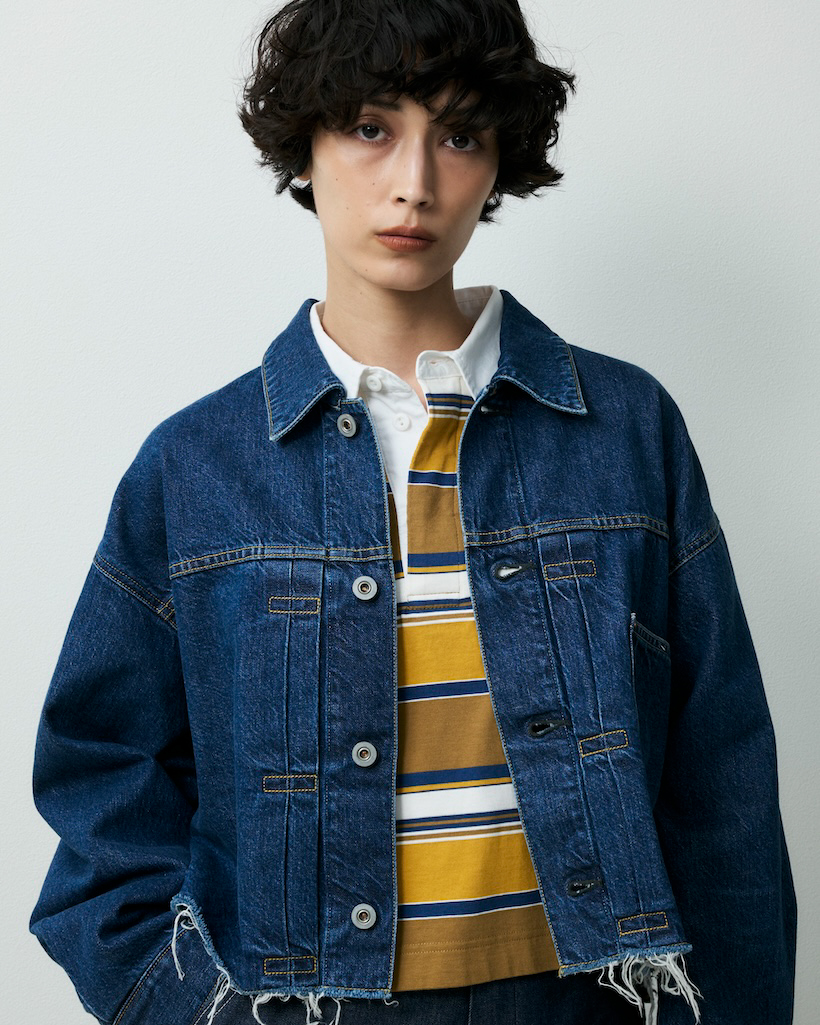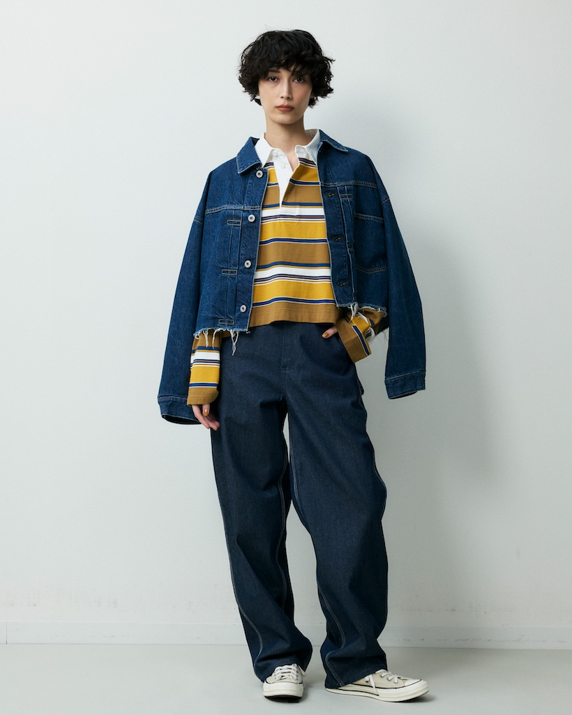 定番のデニムスタイルにトレンドのラガーシャツでスポーティーに。カットオフされたGジャンの丈感にショート丈のラガーシャツが黄金バランス。