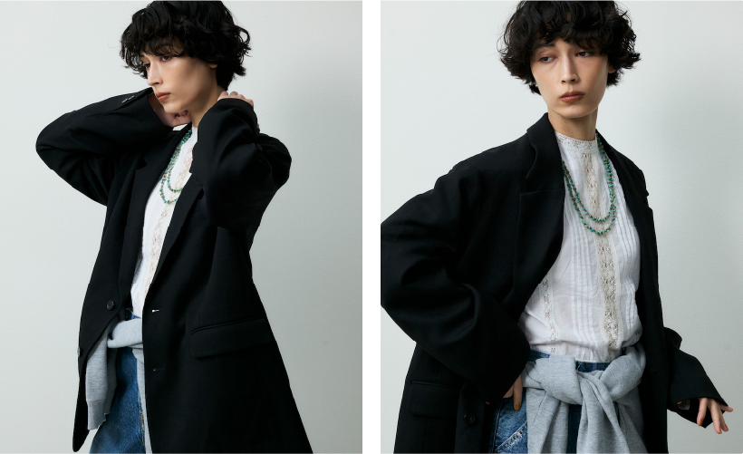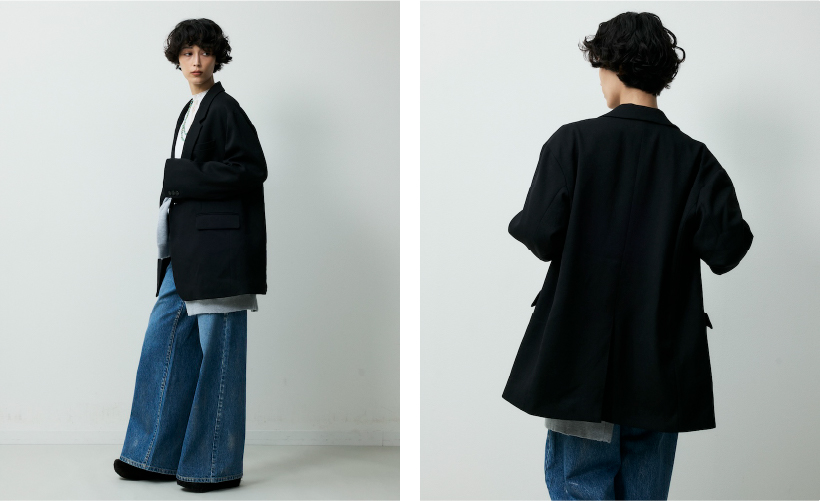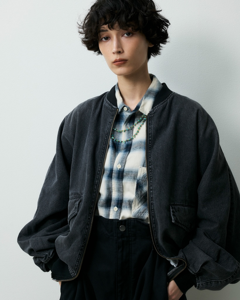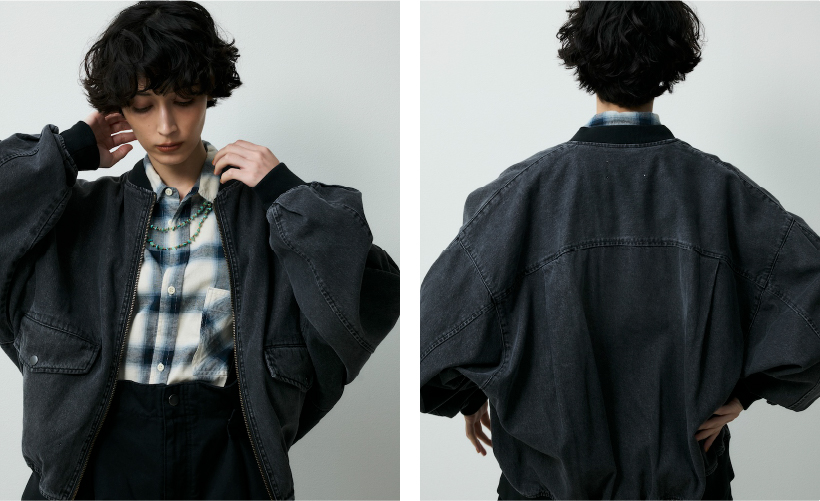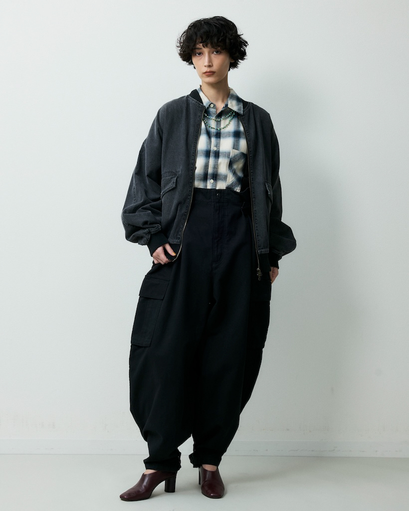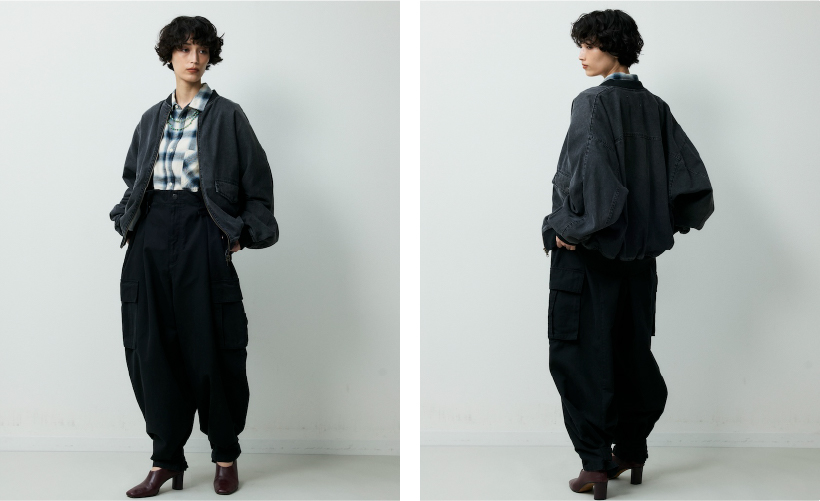ブルゾン、パンツ共にアイテムの特徴であるボリューム感にメリハリを持たせてオーバーサイズながらスマートな着こなしに。