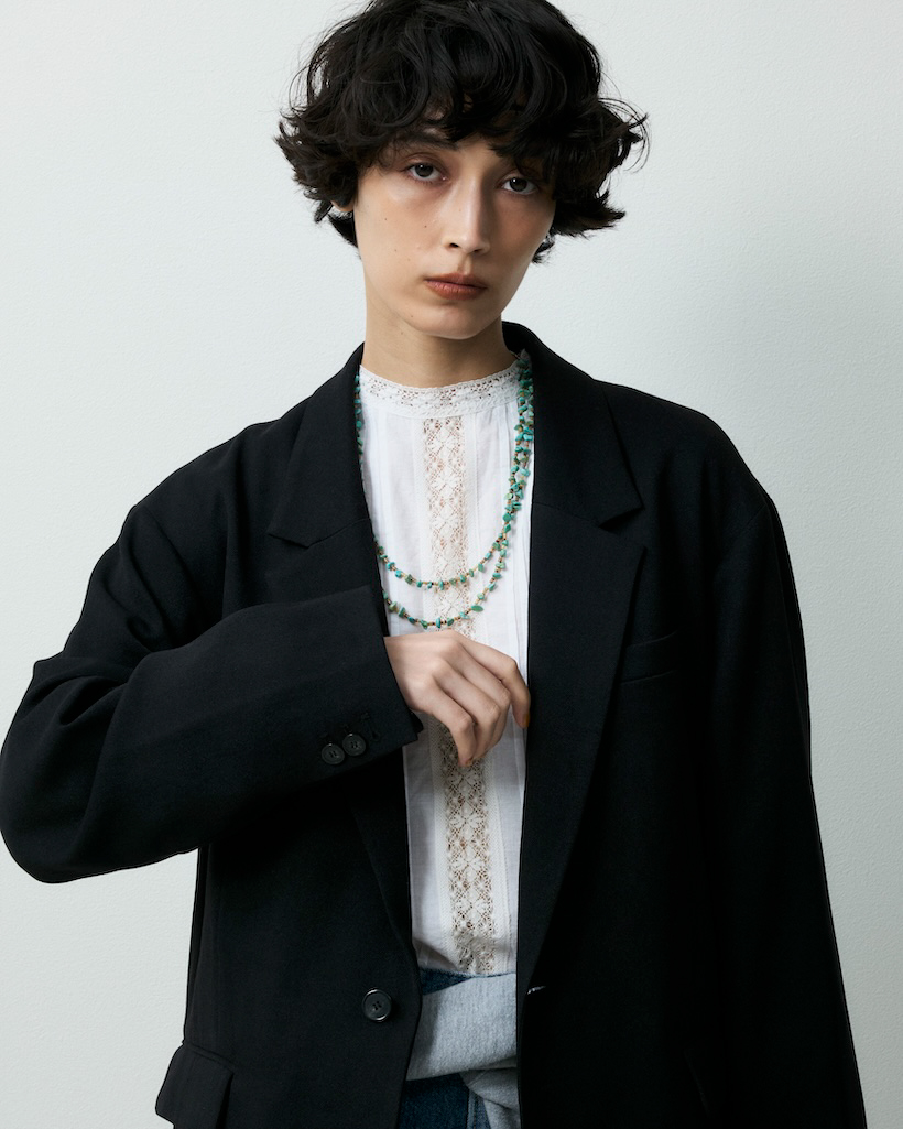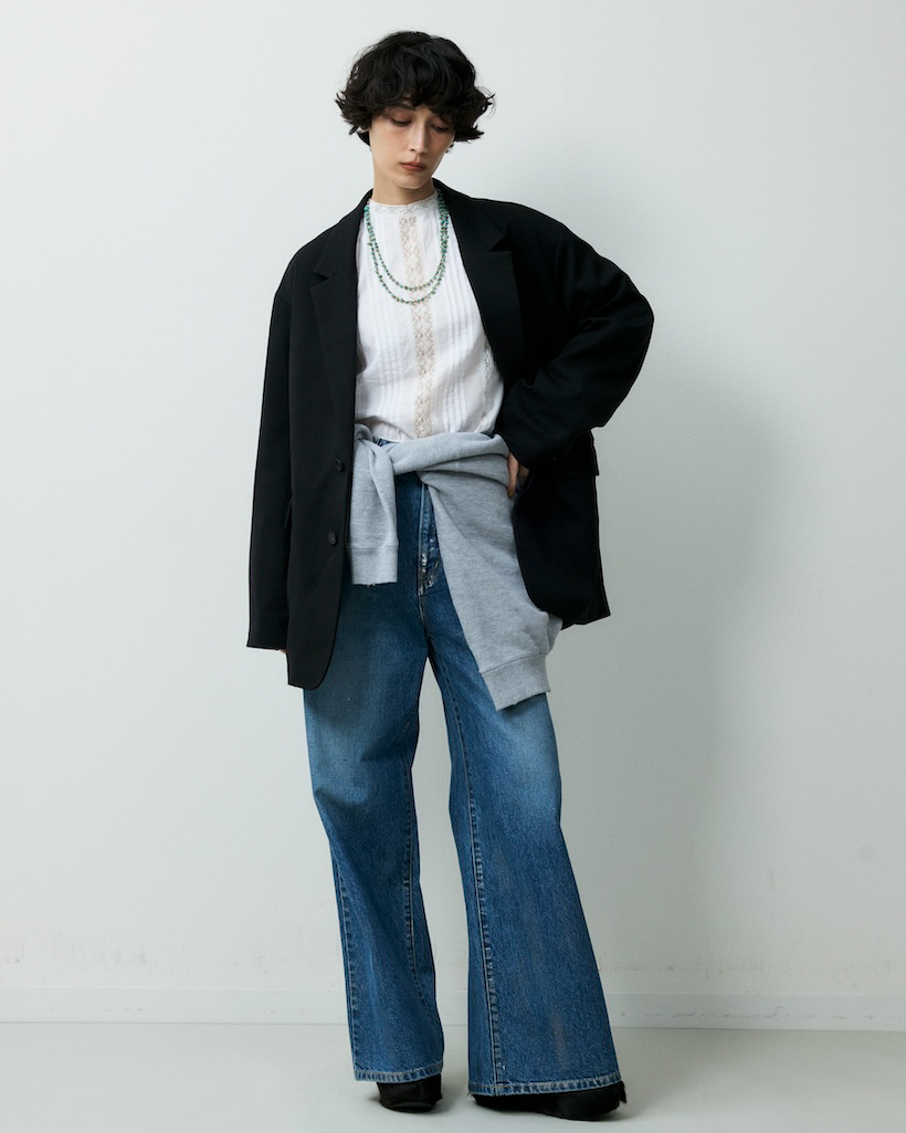 ブラウスとデニムに合わせた王道のジャケットスタイルをアップデート。ポイントは箔加工がアクセントになるデニムと腰に巻いたスウェット。