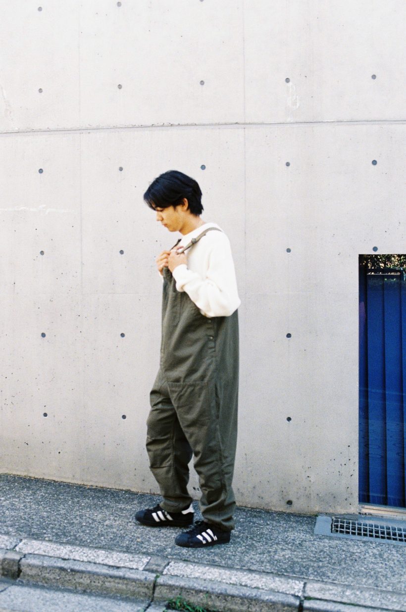kazuki kitahara :『最近購入したベーシックなチェックシャツに、オーバーなサイズ感のオールインワンとスタイリングしました。サロモンのスニーカーを合わせることで、スポーツMIXによる抜け感をプラスしました。』