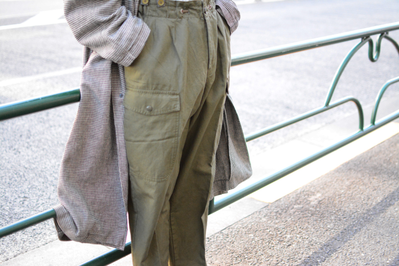 ギミックが満載のサスペンダーパンツは、イタリア軍のパラシュートパンツがイメージソース。無骨なプロダクトに、あえて白シャツと千鳥格子のコートを合わせました。クラシカルなコーディネートがとても新鮮に映ります。