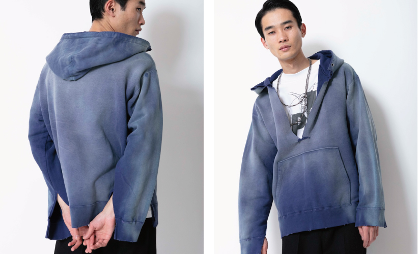 "DENIM DELIGHT DAYS"のフーディーは深めに入ったVカットがインナーのレイヤードを楽しめるように絶妙な計算の上、施されています。リアルなヴィンテージ加工の雰囲気もスラックスとのバランスにピッタリです。