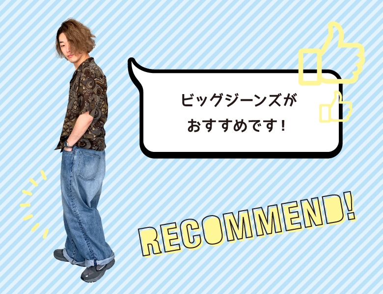 ユニセックスシリーズのビッグジーンズ(Y1001)がオススメですね。毎年買っているような気がする緩いシルエットのデニムですが、爽やかな色味が欲しかったので明るい方を買いました!休みの日も着ているお気に入りアイテムです!