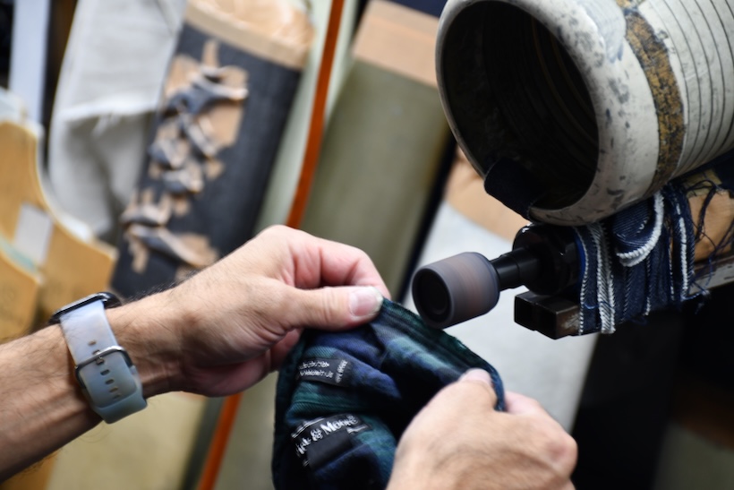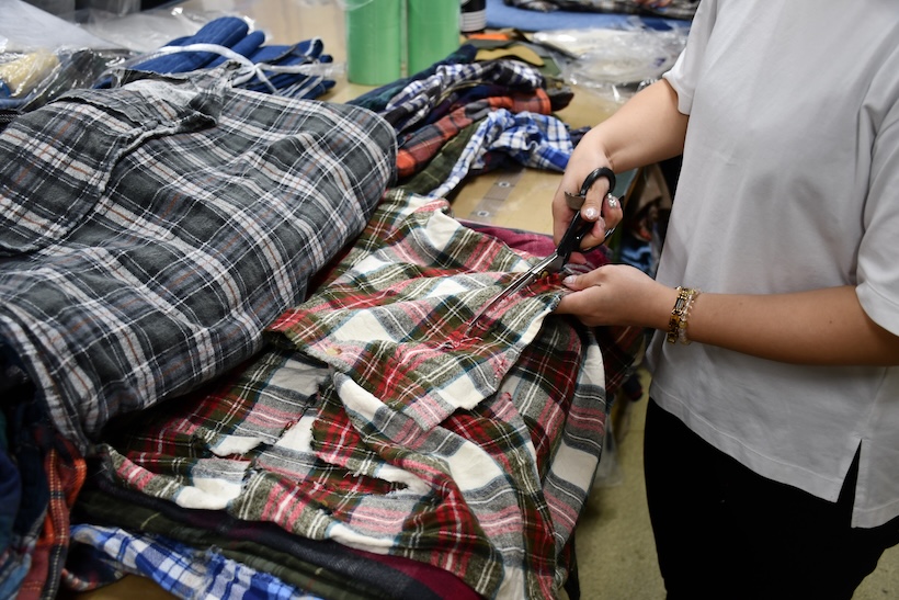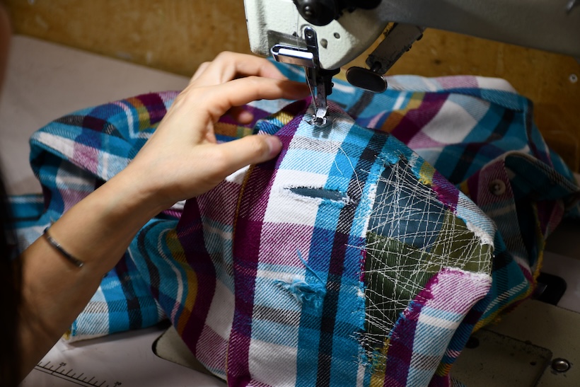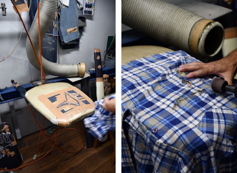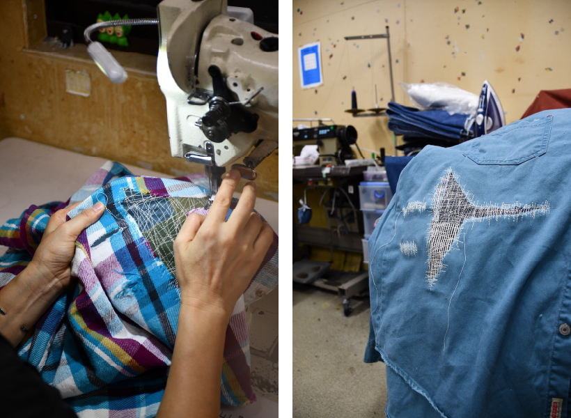 ポストミシンという立体パーツが縫いやすい専門のミシンを使って縫製します。返しボタンが針の右側に付いており、右手の指でボタンを押しながら行ったり来たりを繰り返しあて布を一度で縫いあげていきます。状態の良いシャツの選定から始まり、手作業でのダメージ加工やあて布の配置、縫い上げと、譲れない労力を掛け新しいアプローチで生まれ変わったシャツを、最後に専用の大型洗濯機で製品洗いを行い仕上げてから、各店舗へ入荷し皆様の手元へ渡っていきます。