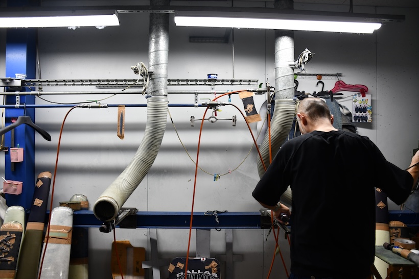 ダメージ加工はグラインダーを使って行います。グラインダーの先端部分は取り外しが可能で、加工する箇所に応じて手持ちで加工を施しています。今回のリメイクシャツはメインのカットする部分の型を作製し、その上にウェアを置いて手持ちでグラインダーを立体になっている型にあてると型に合わせてダメージが入ります。