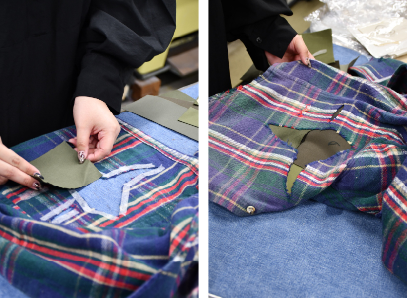 先ほどの工程でダメージを入れた部分を案内線のようにしてカットしていきます。そうする事で自然に破れたようなほつれ感を出す効果があります。そしてシャツの素材や柄に合わせてあて布の色や細かな配置などを1点1点職人が決めていきます。カットした部分を縁取るように両面テープをつけていき、あて布のバランスがズレてしまわないように配置します。